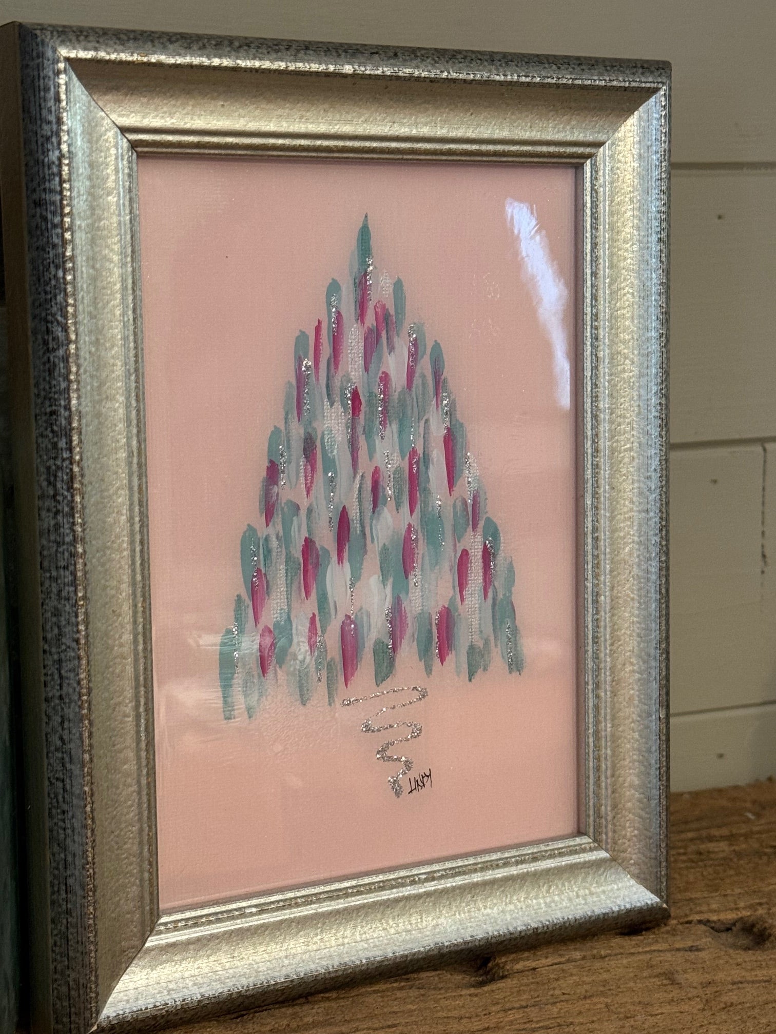 Each decorative piece in this collection is individually hand-painted by artist Lindy Tate and finished with a glass-like resin coating for depth, dimension, and lasting durability. No two are ever alike—each tree or wreath carries its own subtle variations in color, brushwork, and personality. Trees measure 5x7 and wreaths 6x6.